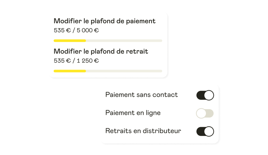 Paramétrez vos plafonds de paiements, de retraits et activez le paiement en ligne et sans contact à votre guise.